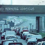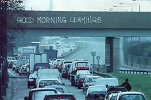 Kyseessä taitaa olla ennemminkin yhteiskunnan loputtomassa oravanpyörässä juoksevien ihmisten rinnastaminen lemmings pelin aivottomiin sopuleihin jotka menevät tasan sinne mihin ne ohjataan. Luulisin.