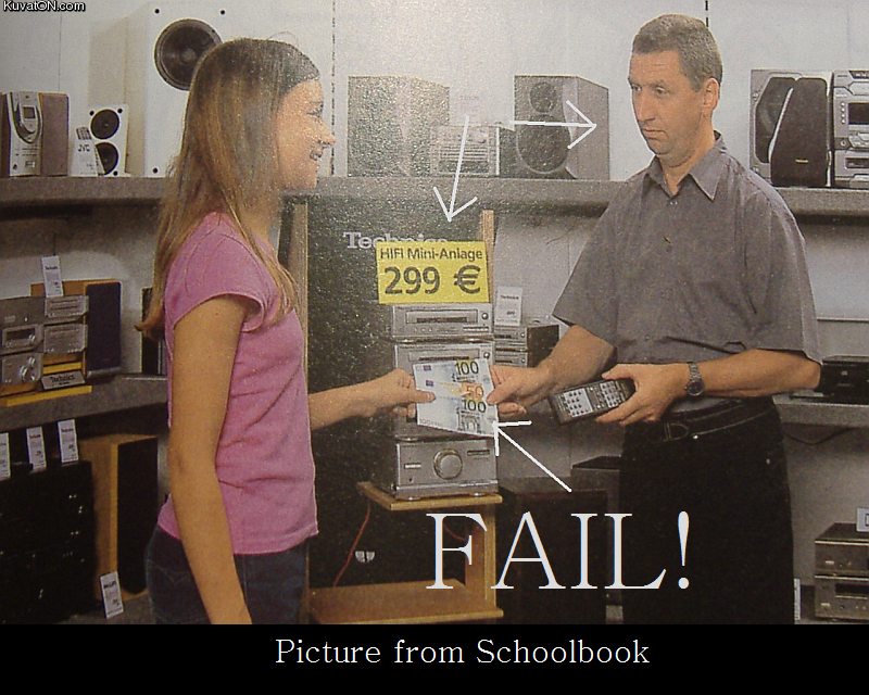| 20.05.10 15:54 | <nololappi900> | Ai säkö luulit että toi mies ostta jotain? -.- |