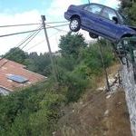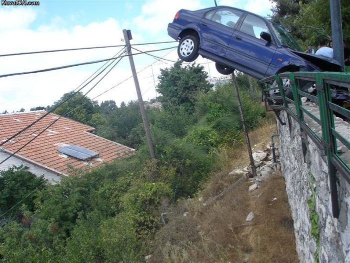 Tai sitten kuvan oikealta tullut etuperin tolppaa kohti, tolppa osunut nokan oikeaan reunaan ja auton perä spinannut vasemmalle, kaide ja sen edessä oleva betonikoroke nostanut perän ylös ja nokka edelleen tolpan ja betonin välissä ja auto pysyy siin