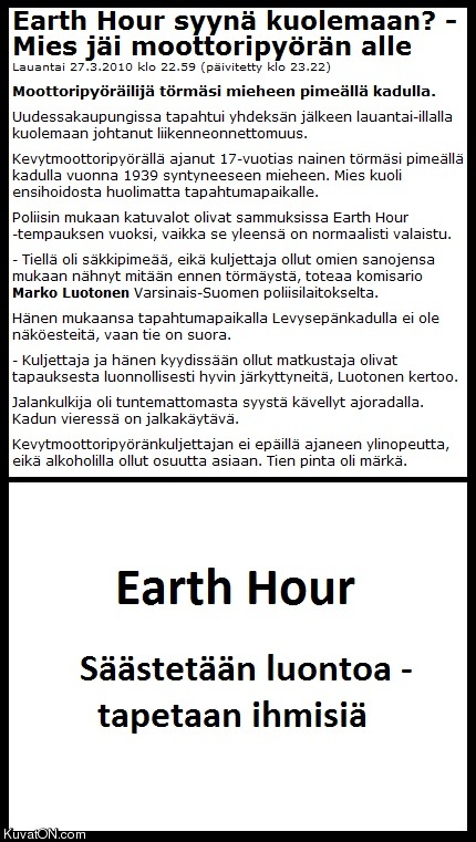 Tollasia pimeillä kujilla tapahtuvia onnettomuuksia tulee maailmassa melkeinpä päivittäin.. Tuo nyt sattumalta oli Earth Hourin aikaan ja nyt media innostui että tehdäänpäs tällä kertaa tästä jutusta meteliä...