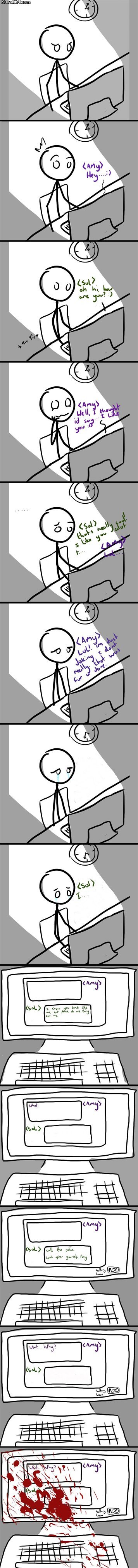 No musta huumoriha o hauskaa. En mää ny usko että kukaa itteensä oikeesti tappas, ku tyttö sanoo netissä etten tykkääkkää susta, kyllähä se vois harmittaa, mutta itsemurha tommosesta, hohhoijjaa. Miks olis lapsellista? Hiukan huonompana makuna pidän