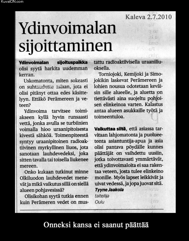 kaikki ydinvoiman vastustajat taitaa olla samaa mieltä
