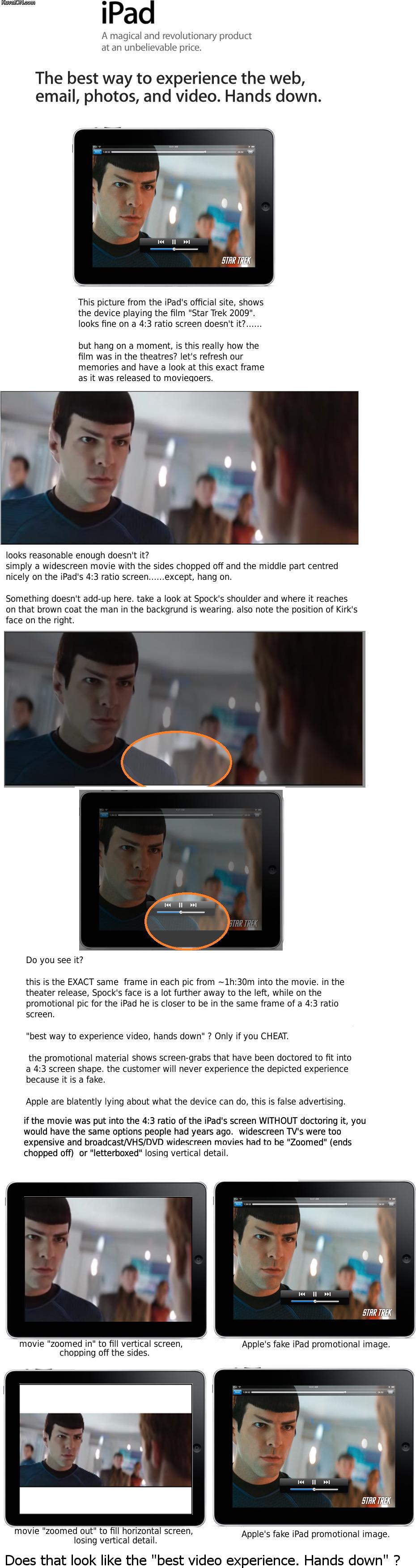 ^Ideana olikin se, että Apple yrittää esittää että elokuvat toistuvat nätisti koko näytön koolla ilman näitä reunuksia. Sitä paitsi nykyisissä 16:10 ja 16:9 näytöissä ei ole läheskään noin suuria "reunuksia".