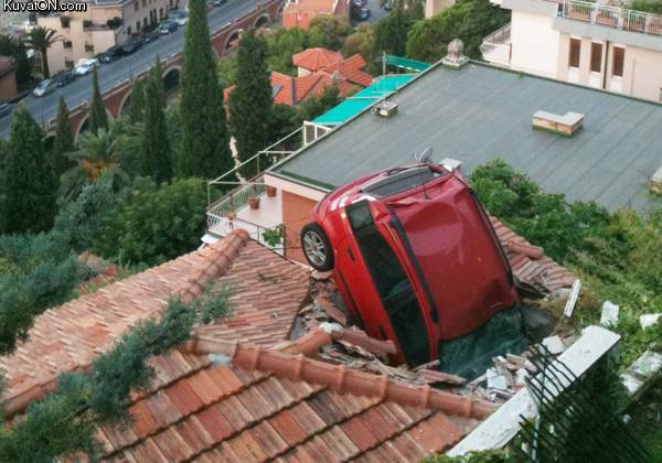 Peruutettu kaiteen läpi vauhdilla (kuvassa nakyy kaiteen paloja), ensin takapää rikkoo katon, liikemäärä vie vielä taaksepäin ja kun etupää putoaa takapään tekemään alkureikään, niin läpi meni. Näin ainakin luulisin. Kuskilla kevyt tuuri, putous ...