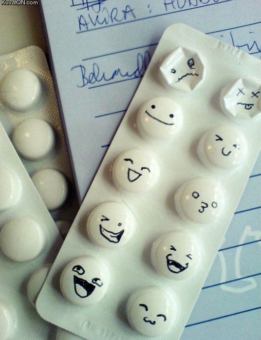 | 28.08.10 19:46 | <Dayu> | Ei oo välttämättä huumeita, mulle tuli ekana masislääkkeet mieleen vaikkei ne kyl oikeesti noin vauhdilla toimi :D |