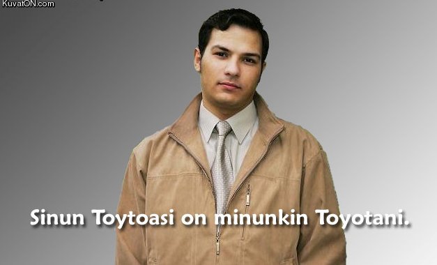 Tuo mainoslause kyl kuulostaa vähä somalin sanomalta. Tosin kyseinen lause voisi tulla somalin suusta muodossa "Sinun Toyota olla nyt minun Toyota"