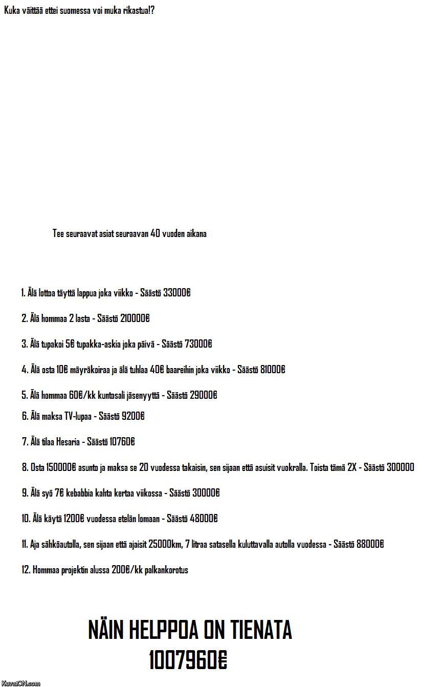 Totta :D Mutta 40 vuotta kohtuullista elämää vs 40 vuotta ilman mitään hauskaa, tuut miljonääriks, mutta oot jo niin tottunu (ja muutenkin tullut pihiksi) että ei sitä 1m koskaan käytä. Lapset ja lapsen lapset voi sitten ostaa pleikka 9 ja huoria.Jee