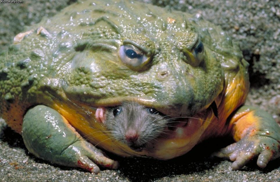 Toi on australialainen rupikonna. Tuotiin joskus viime vuosisadalla sinne syömään pelloilta kettupäitä. Sillä ei ollu petoeläimiä siellä niin ne lisäänty vitsaukseks.
