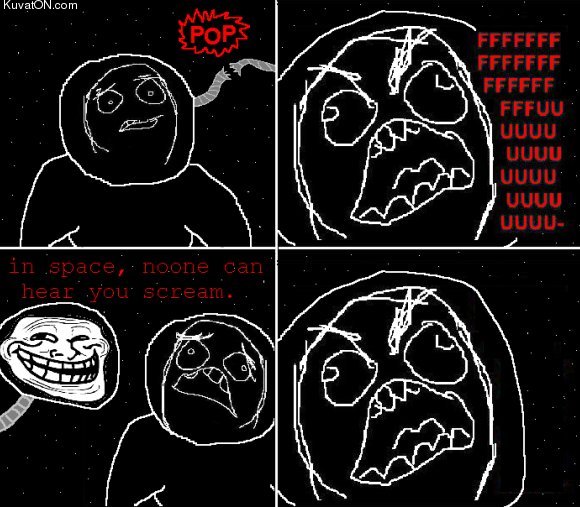30.11.10 12:13<DjZorlag>hyvä oli kyllä. Trollface ilmottaa että kukaan ei kuule huutoa avaruudessa ja sen jälkeen sitä ei sitte enää kuulu....