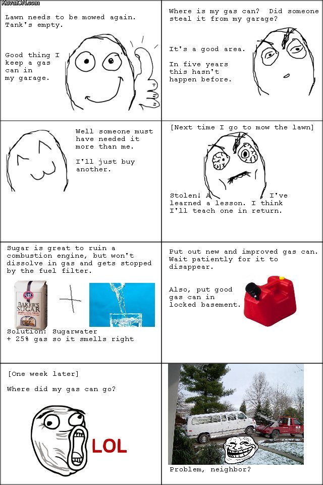 Mä luulin et lopussa olis "fffuuu". Naapuri ei olisikaan vienyt kanisteria, ja tuo olis kipannu sokeribensan omaan leikkuriinsa. Ainakin mulle olis tietysti tapahtunut niin.