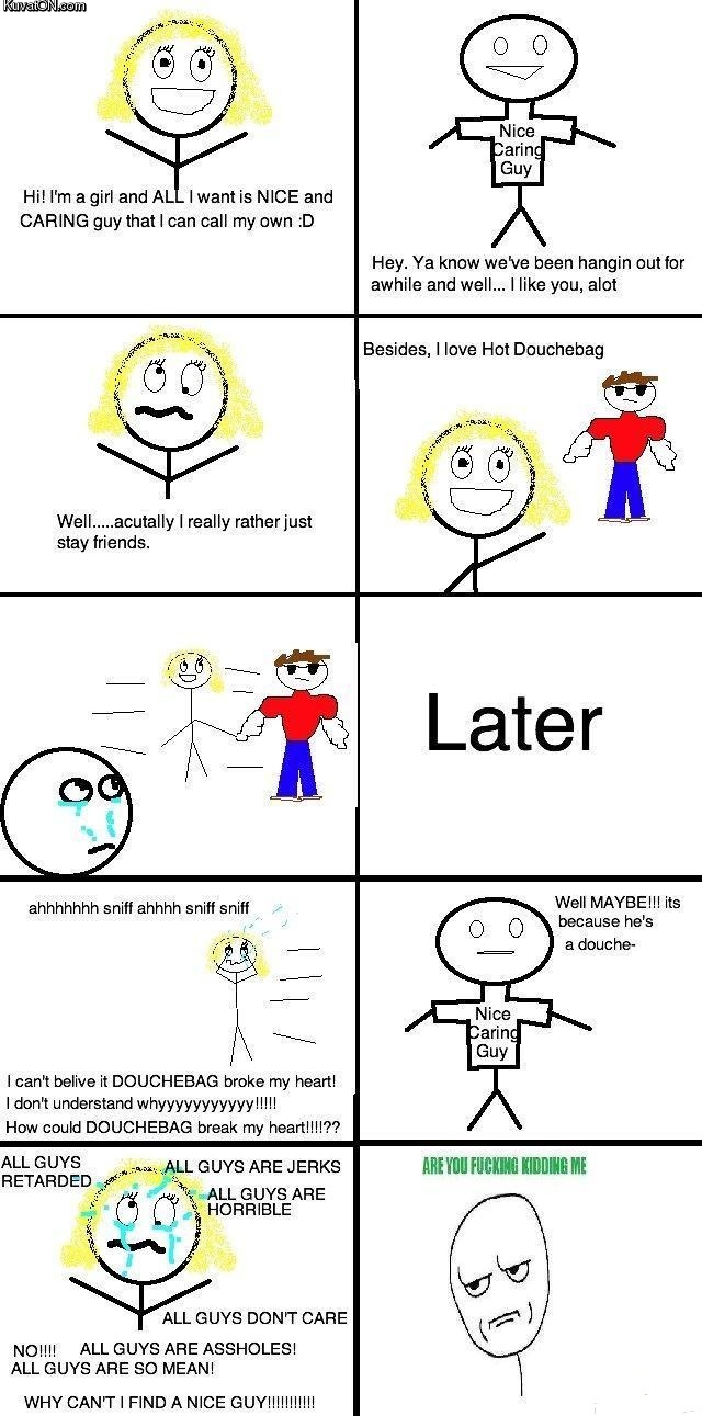 tää ei oo totta. jotkut (krhmmm) tajuu heti että kandee ehkä valita toi nice, caring guy, eikä douchebagit kiinnosta. joku on taas ollu katkerana :s