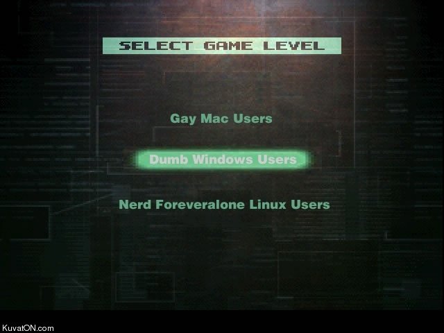 +1, ei loukannut yksinäistä sieluani koska kaikki käyttäjätyypit sai nokkiin :) @Yeou, njoo, mä oon päätellyt että windows on mulle liian vaikea monien asioiden johdosta jotka osaan linuxilla mutta tuntuu dozella itelle kryptisiltä jos mahollisilt :)