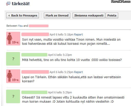 mä oisin sanonu takas et voitko nimetä muksus kun mun koiran nimi on tino nii se on alentavaa että sun surkee muksus on saman niminen kun mun koira