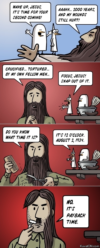 Kyllä se Hitler rämpi niissä juoksuhaudoissa ennen 1934.. Mutta hyvä kuva, saa odottaa vielä seuraavat 2000 vuotta jeesuksen kostoa...