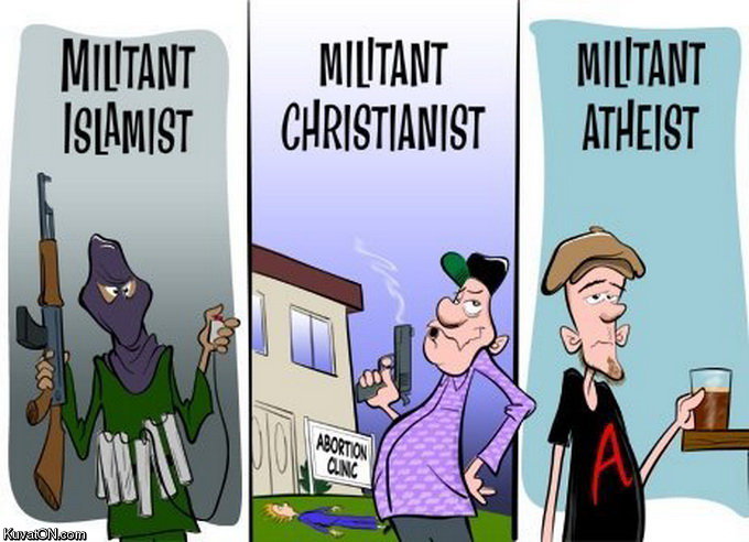 Militantit ateistit rauhallisia? Muistaakseni sitä lössiä on lahdattu ateisminkin nimissä ihan kelvollinen määrä...
