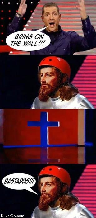Noniin.Itse tajusin toisella kerralla,kuvan ide on siis se että se on matkittu reikäseinässä ohjelmasta: DD''tässä tulee seinä!'' BRING ON THE WALL ''jossa siis jesse joutuu menemään