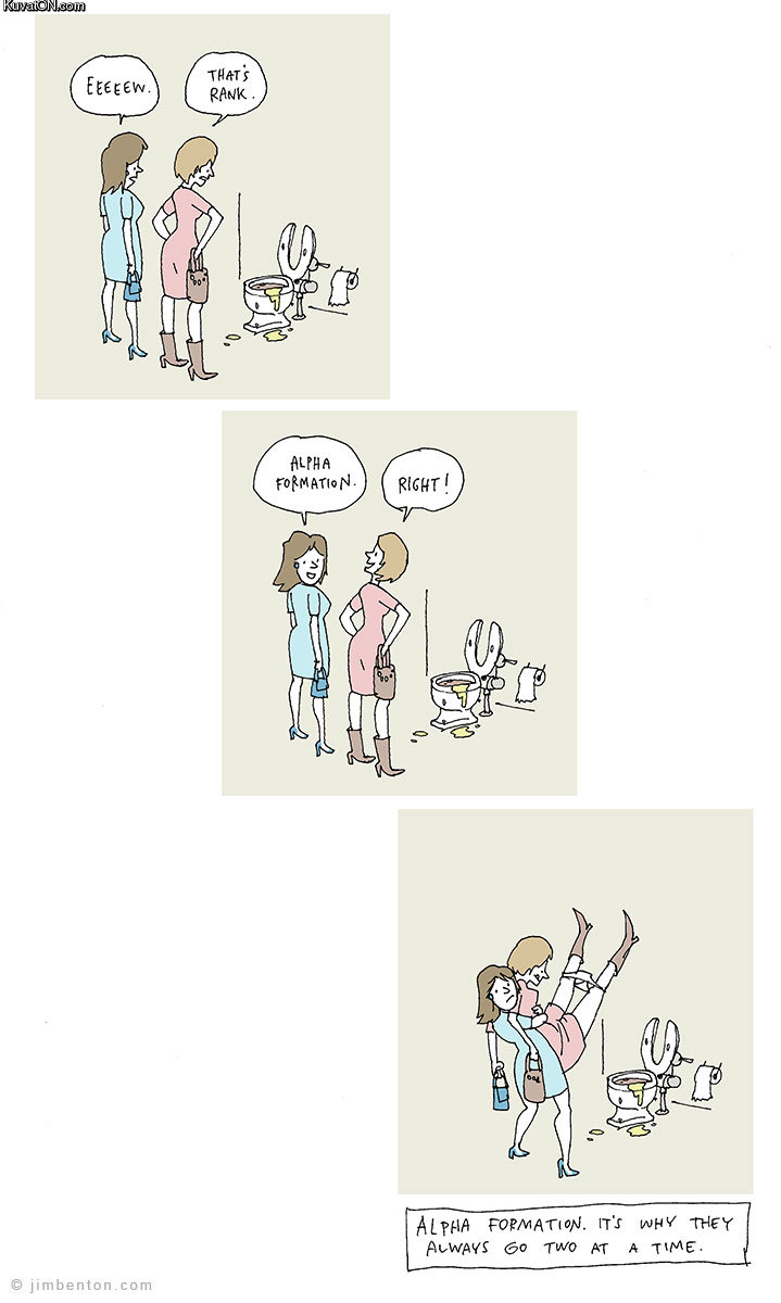 Eikueiku, sori pojat. OIKEA syyhän sille että naiset käy porukalla vessassa on pyyhkiminen! Te näette oman ulokkeenne, me emme. Kaveri tarkistaa että kaikki on kuivattu. Yksinäisiä tapauksia varten on käsipeilit.