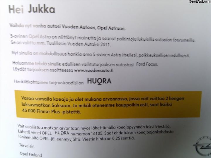 | 17.09.11 21:01 | <jooooooo> | HUQRA, varaa samalla koeajo ja olet mukana arvonnassa :DDD |