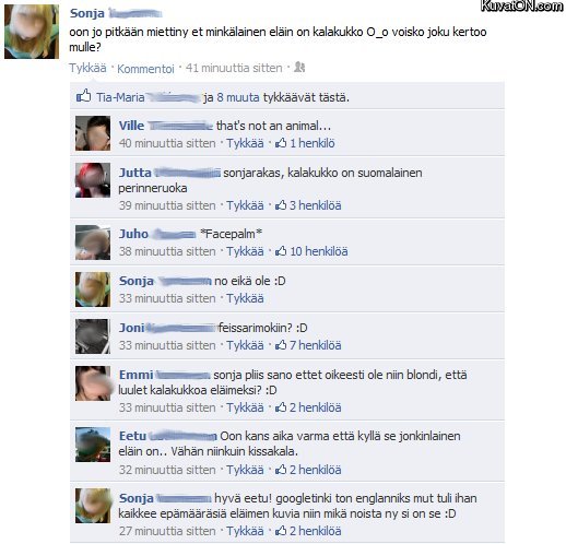 | 19.10.11 18:39 | <smallerthanyou> | voin vaa sanoo et sonjan joku kaveri oli laittanu ton sen seinälle :D ties ihan hyvin mitä kalakukko on :D |