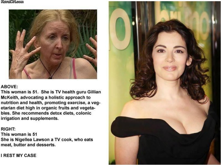Mitä kuvaan tulee, niin oikeanpuoleisella taitaa kyllä olla geenien lisäksi myös meikki ja plastiikkakirurgia puolellaan. Liioittelu mihinkään suuntaan terveysasioissa ei juuri ole hyväksi.