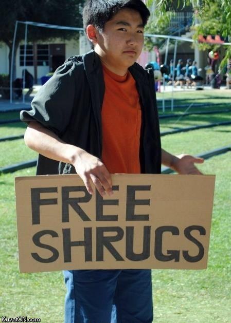 | 06.12.11 21:36 | <japichan> | Idiooteille tiedoksi: "Free shrugs" tarkoittaa "ilmaisia olankohautuksia". |