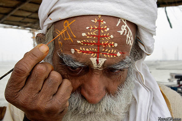 A Hindu man writes "Happy Christmas" in Hindi on his forehead on the banks of the Ganges river in the northern Indian city of Allahabad, India, December 19, 2011 http...s-of-the-day-dec-19-2011/