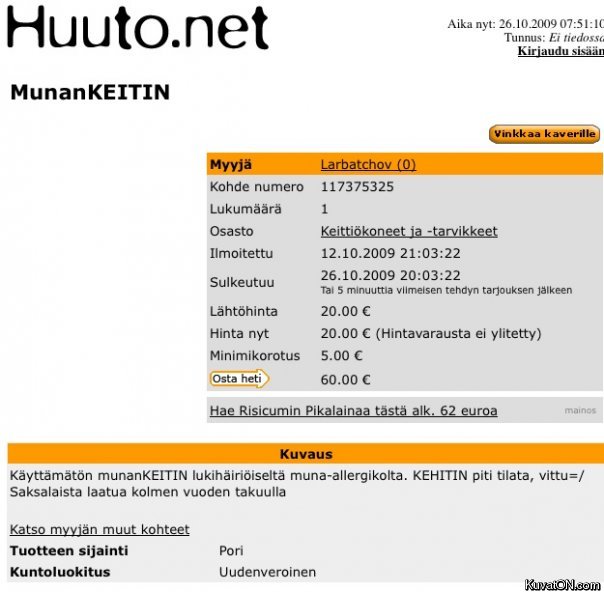 | 21.12.11 23:21 | <Padi740> | Pistin miinusta ja sen jälkeen tajusin vasta mikä munankehitin on, jos oisin tajunnu vähän aikasemmin nii ois herunu plussaa :( |