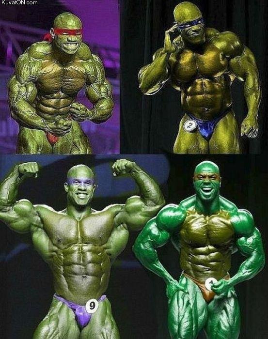 Mä tiedän noitten kaikkien nimet: Leonardo, Raphael, Donatello ja Michelangelo. Tosin järjestys vähä sekasin mut ei se mitää