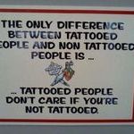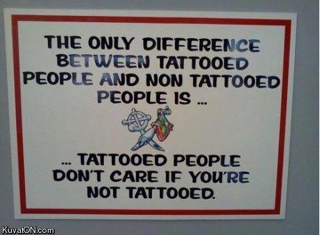 Tuo ei ole totta. Tiedän monta tatuoitua tapausta jotka katsoo tatuoimattomia ihmisiä pitkin nenänvartta vain siksi etteivät he ole laittaneet mitään rumaa kuvatusta nahkansa "koristeeksi".