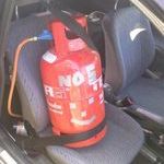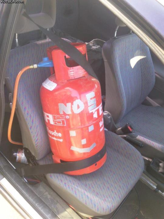 Vitsi taitaa olla, että paikallinen amis heitti paremman mestan sijasta tuon kaasupönikön tuohon pelkääjän paikalle. Ja huomatkaa ammattimainen kiinnitys.
