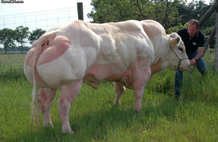 Ihan luonnollisella jalostuksella Piedmontin karja on saatu aikaan, niillä on geneettisesti myostatiinin alituotantoa joka saa lihakset kasvamaan hurjiksi: http.../Piedmontese_%28cattle%29