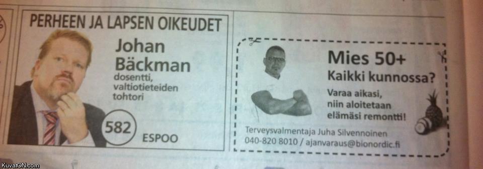 | 01.11.12 14:54 | <xocoatl> | Harmi vaan, että Bäckmanni on syntynyt 70-luvulla, joten +50 ei vielä ajankohtainen. |