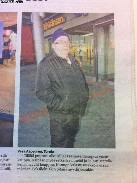 Niin ja puolet taloista tyhjillään, toinen puoli pitää naisten vaatteita ja on vaan niinku tiätsä gay.