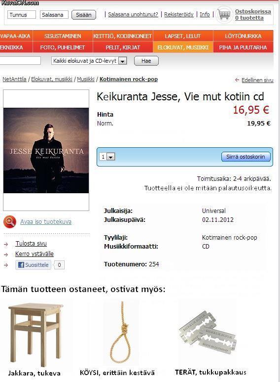 | 25.03.13 15:03 | <waldderi> | HAHAHA FEIKKI KOSKA tuolta ylhäältä näkyy että kategoria on "MUSIIKKI" ja jakkarat, köydet ja partaterät kuuluu sisustukseen!!! HAHAAHA!!11yksi |