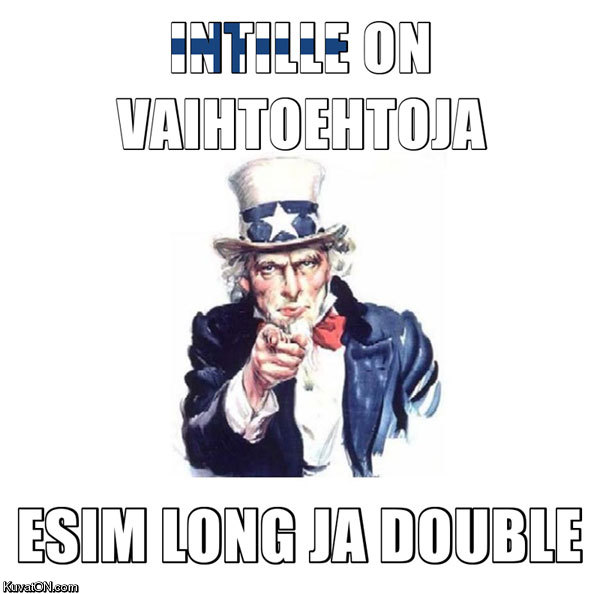 Intti on turha. Paitsi urpoille, ketkä ei saa omaa persettään pyyhittyä ilman äidin apua + läskeille, ketkä voivat mennä laihtumaan. + Suomi Natoon, ei ole tehokasta puolustuspolitiikkaa luottaa EU-joukkoihin..